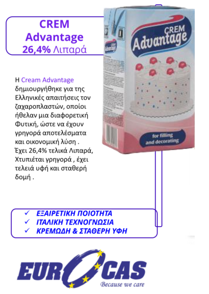 Η Φυτική Κρέμα Ζαχαροπλαστικής ADVANTAGE, Δημιουργήθηκε για τις Ελληνικές απαιτήσεις των ζαχαροπλαστών, οι οποίοι ήθελαν μια διαφορετική Φυτική, με γρήγορα και οικονομικά αποτελέσματα. Η Prontalluso είναι η πρώτη και η πιο διαχρονική Φυτική μας κρέμα. Παρασκευασμένη σύμφωνα με μια κλασική ιταλική συνταγή, η Prontalluso έχει όλα όσα θα θέλατε σε μια Φυτική Κρέμα: μεγάλο όγκο, εξαιρετική δομή, λεπτομερή διακόσμηση, χωρίς πόρους & ρωγμές, και φυσικά ανταγωνιστική τιμή.